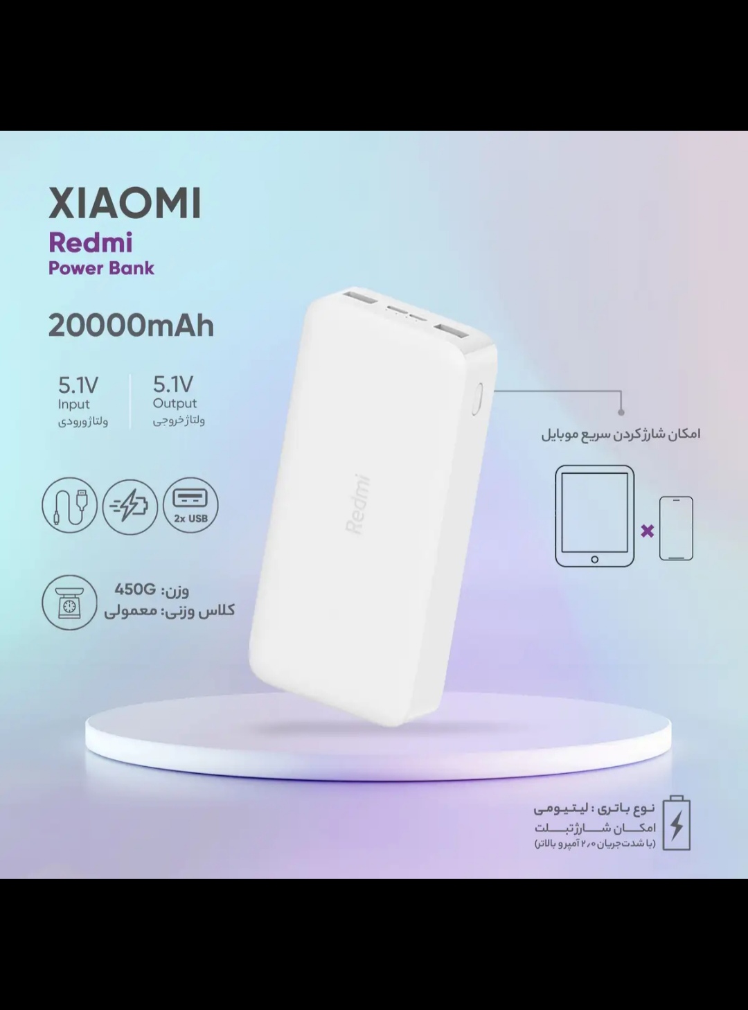 پاوربانک شیائومی با ظرفیت 20000 میلی آمپر اورجینال،قابلیت شارژ سریع،مقاوم در برابر ضربه و حرارت،سازگار با تمام دستگاه های دیجیتال،موبایل،تبلت،دوربین،دارای 2 خروجی